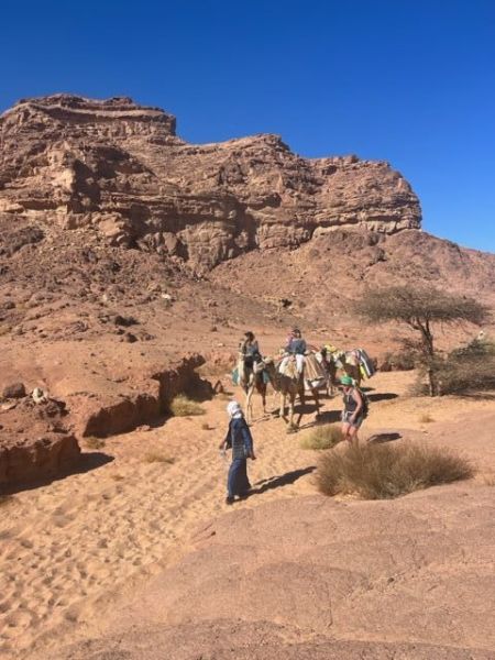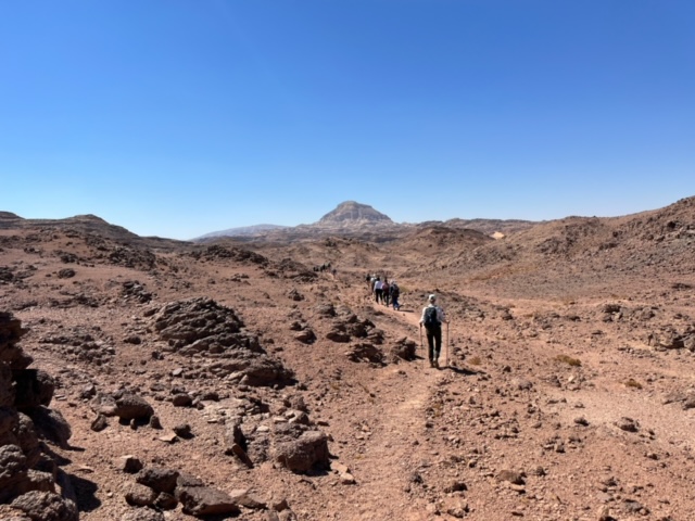 De reis begint in Sharm-El-Sheikh aan de Rode Zee in Egypte, alwaar Sheik Faraq Soliman en zijn gezin ons vanuit zijn typische grote Arabische gastvrijheid zullen ontvangen. Met minibusjes zullen we de volgende dag door een fascinerend landschap naar het begin van onze tocht, iets verder landinwaarts in de Sinaï woestijn gebracht worden. 11 drommedarissen en 8 bedoeïenen wachten ons daar op en gaan ons voor over een eeuwenoude route de woestijn in. Hier en daar een boompje, maar voor de rest bruine stenen, rood zand en scherpe, zwart getande rotsen, stilte, ruimte, leegte. Na een paar uur in stilte gelopen te hebben wordt er een eenvoudige, maar smakelijke Arabisch gekruide lunch gemaakt, met ter plekke gemaakt plat brood, uiterst smakelijke tomaten, geblakerde aubergines en andere heerlijkheden. Na de lunch is het een klein uur de ogen sluiten of op een andere manier tot rust komen, voordat we weer verder lopen, in twee etappes tot de plek waar we ons kamp opslaan.